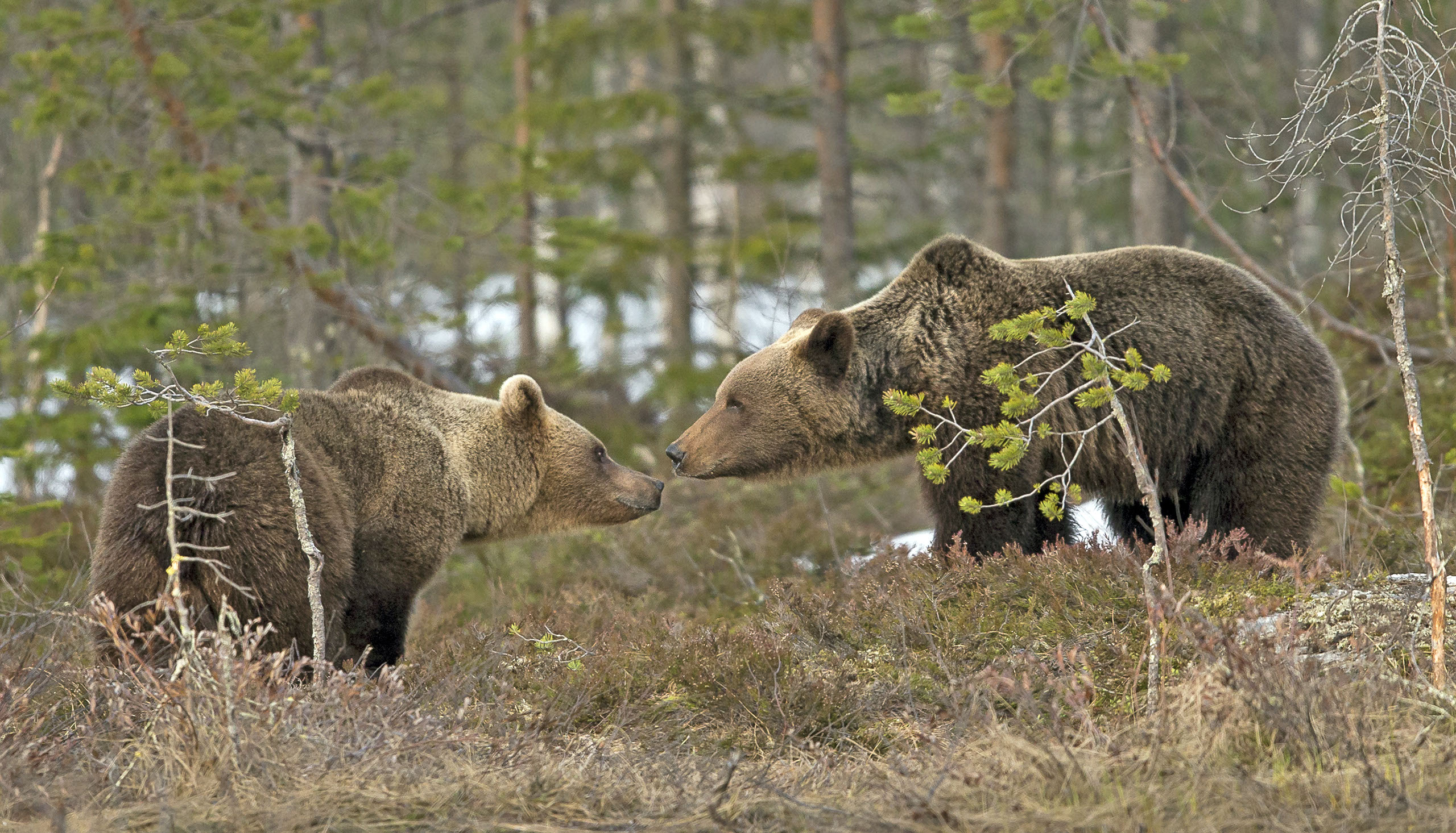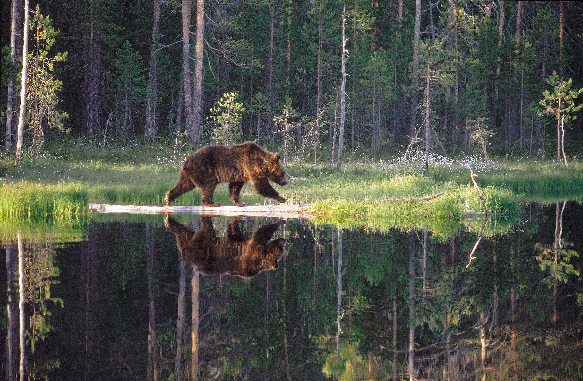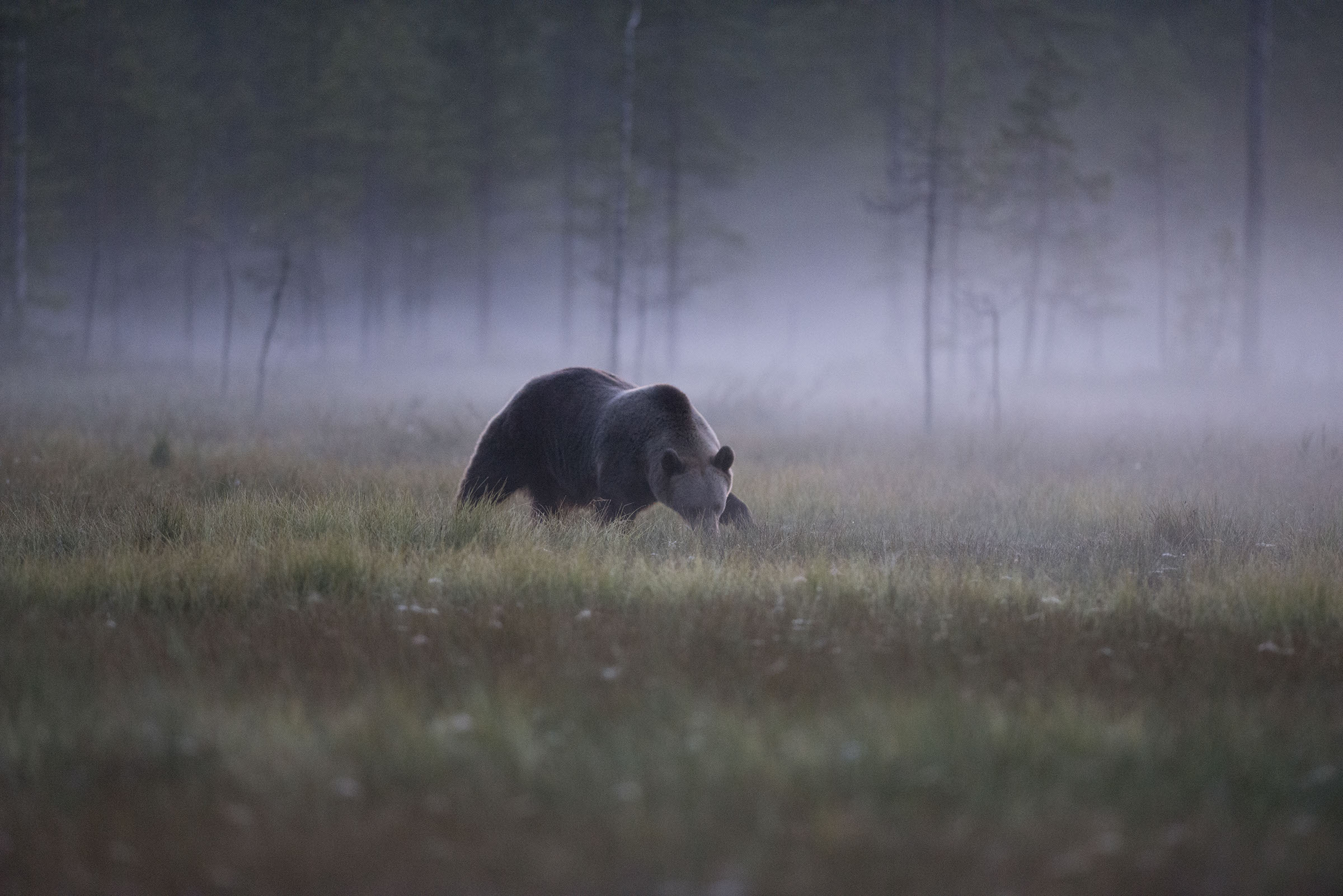 This far north, the sun sets and rises slowly and the spring nights are slightly longer and darker. With each day, daylength increases towards summer and the nights of Midsummer are bright enough for photographing throughout the night. After that the daylength slowly decreases towards autumn to darker nights again. Due to this change of light, it is possible to photograph bears in diverse light situations.